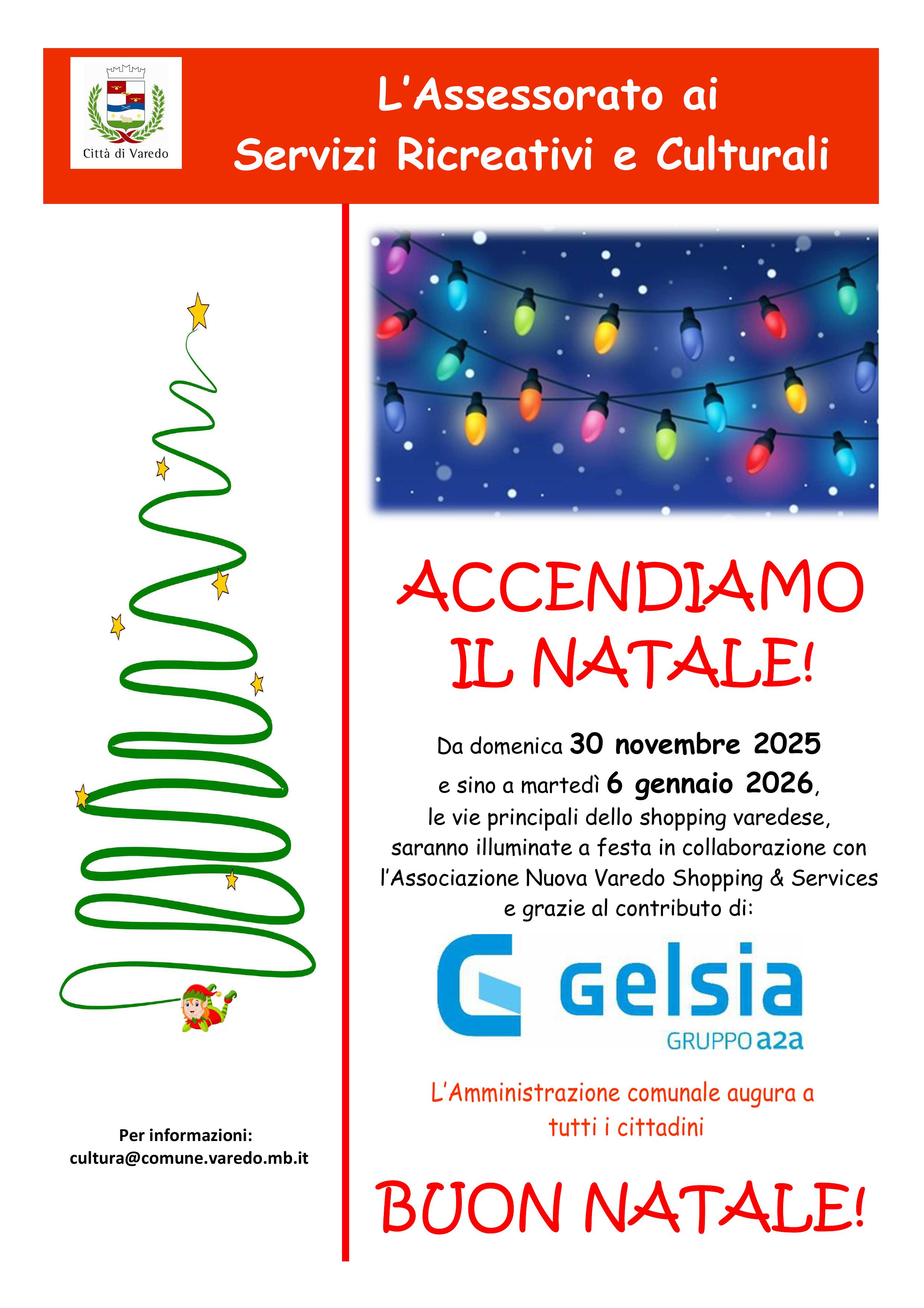 Da domenica 30 novembre 2025 e sino a martedì 6 gennaio 2026, le vie principali dello shopping varedese, saranno illuminate a festa in collaborazione con l’Associazione Nuova Varedo Shopping & Services e grazie al contributo di Gelsia.