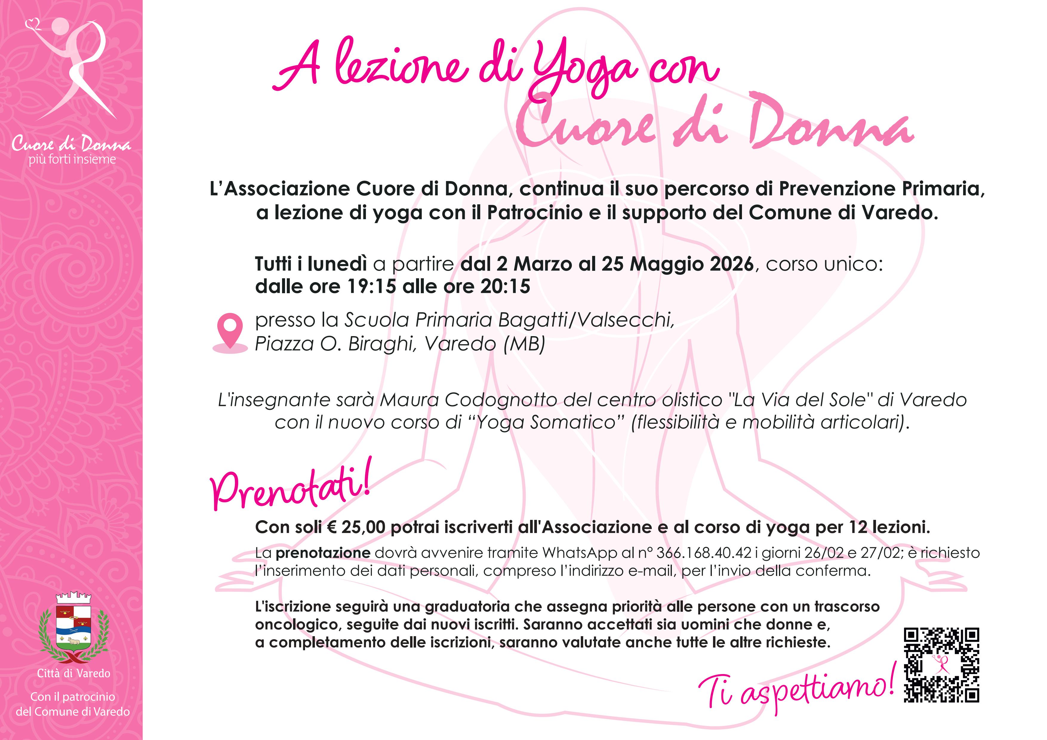Tutti i lunedì dal 2 marzo al 25 maggio 2026, presso la scuola primaria Bagatti Valsecchi, lezioni di yoga dalle ore 19:15 alle ore 20:15.