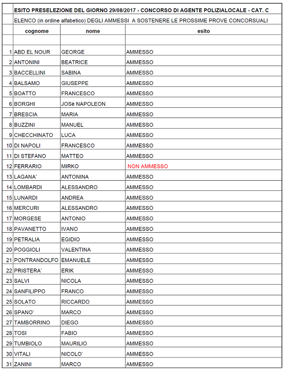 Esito prova preselettiva concorso agente di polizia locale cat. C.